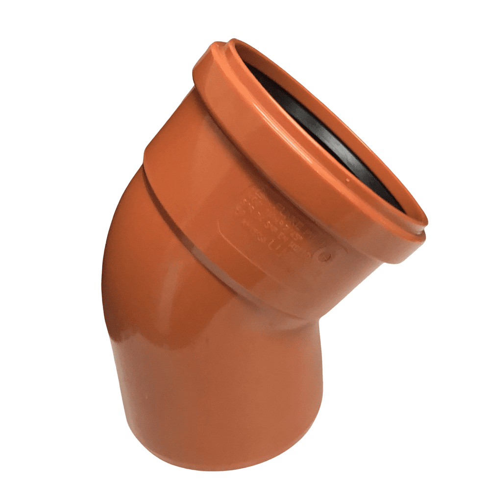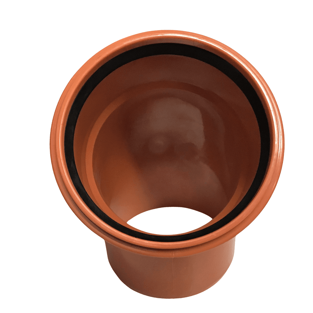Funke 45 Degree Single Socket Bend With the red-brown Underground Drainage Pipe (UG) SN 8 – compact design in the nominal diameters DN/OD 110, we offer a solid-wall pipe made out of PVC-U.
