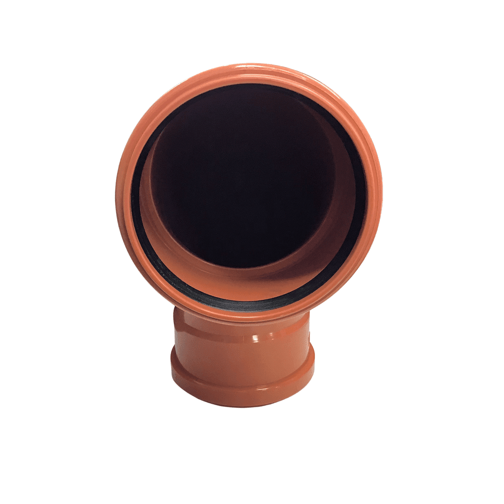 Funke 90 Degree Double Socket Bend With the red-brown Underground Drainage Pipe (UG) SN 8 – compact design in the nominal diameters DN/OD 110, we offer a solid-wall pipe made out of PVC-U.